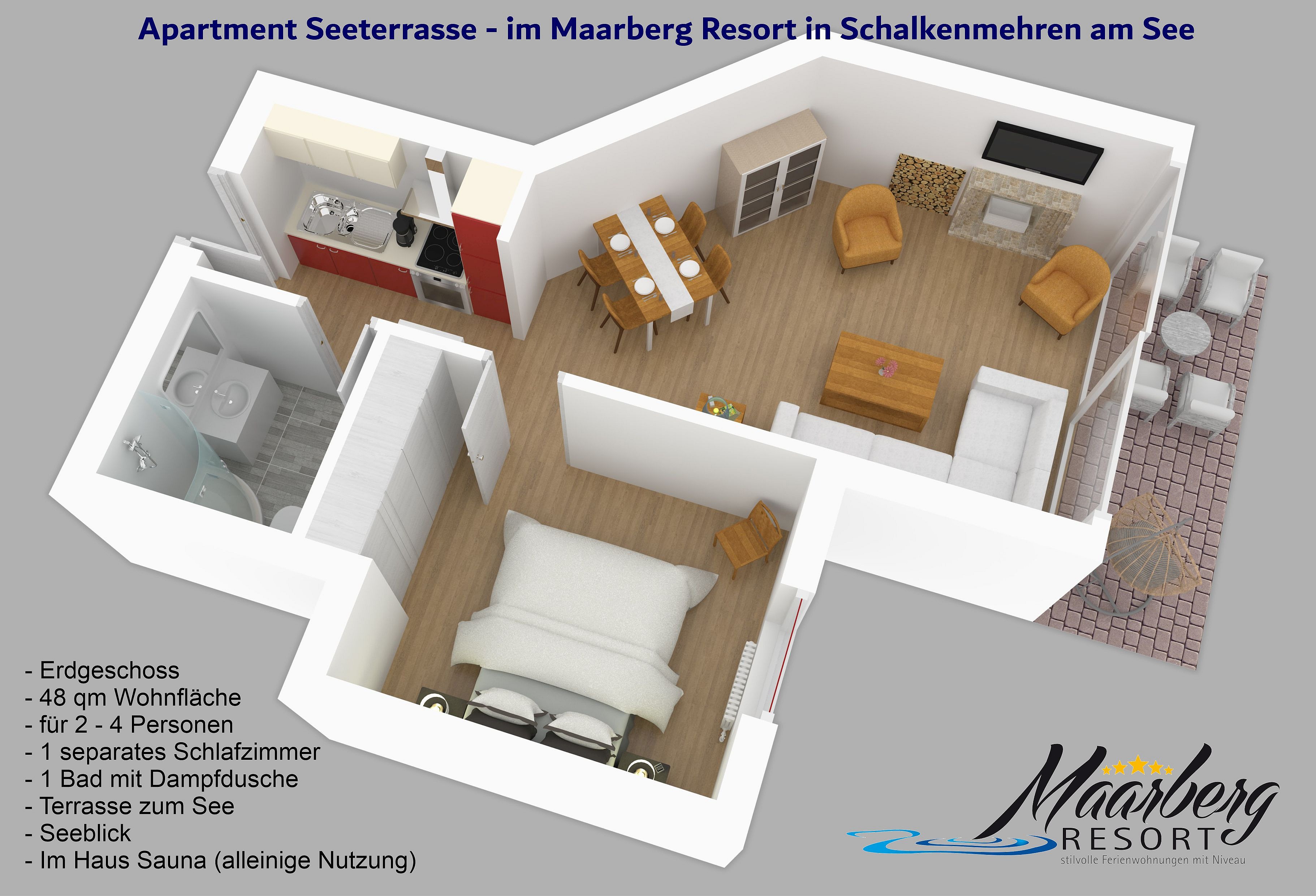 Het resort: Ontvangsthal met receptie. Sauna en solarium vindt u op de onderste etage van het “Maarberg Resort”. Deze sauna kunt u ook voor u alleen gebruiken (afsluitbaar). Op de onderste verdieping vindt u ook een ruimte met wasmachine, wasdroger, strijkijzer en strijkplank.