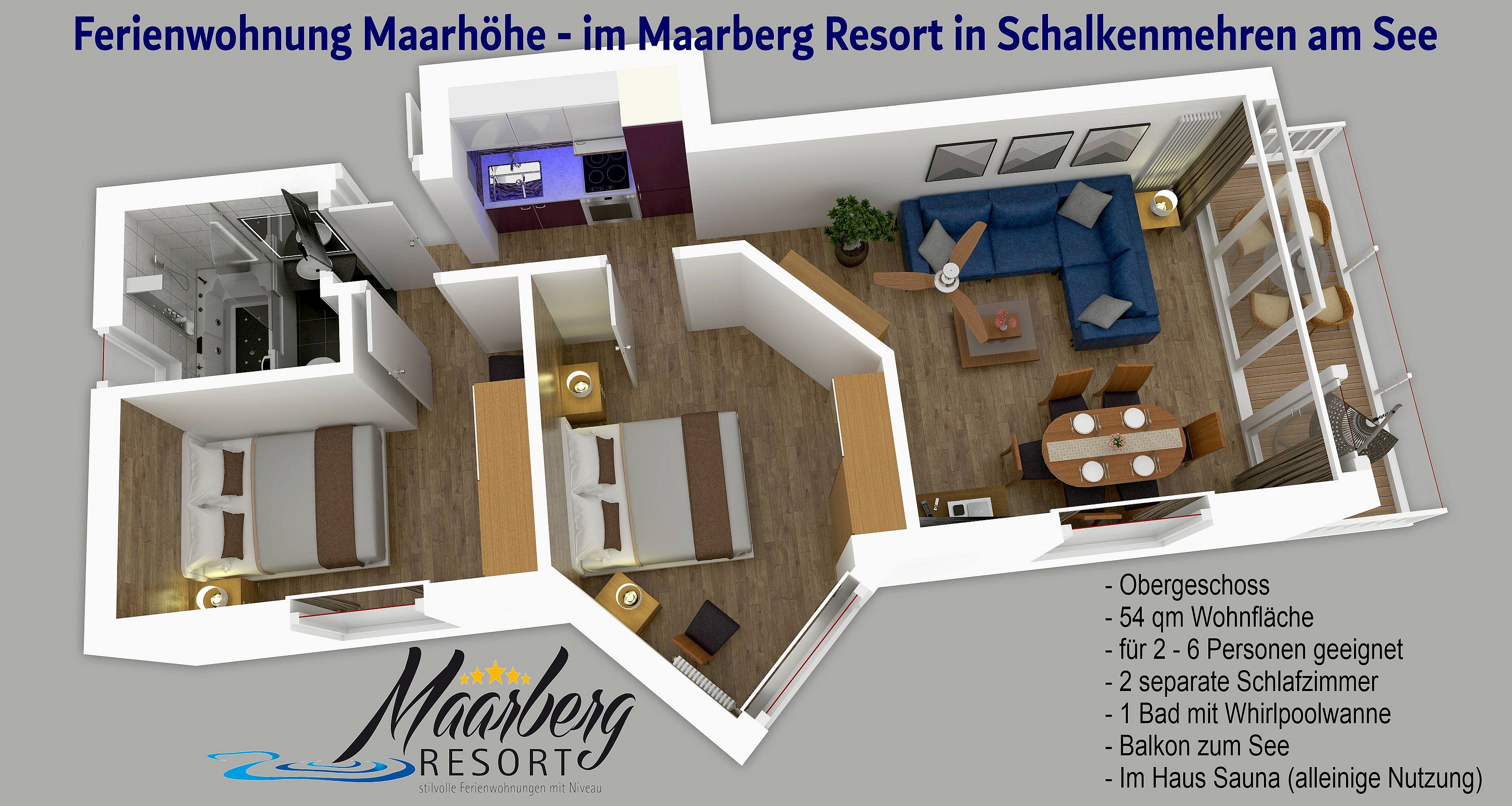 Een elegant, compleet nieuw ingericht vakantie-appartement voor 2 tot 6 personen. Ongeveer 54m2 woonoppervlak met balkon richting meer en siervijver, met een heerlijk panorama uitzicht over het meer, de twee siervijvers, de watervallen, de beekjes en het kiezelveldje. Het vakantie-appartement Maarhöhe ligt op de bovenste etage (1trap hoog).