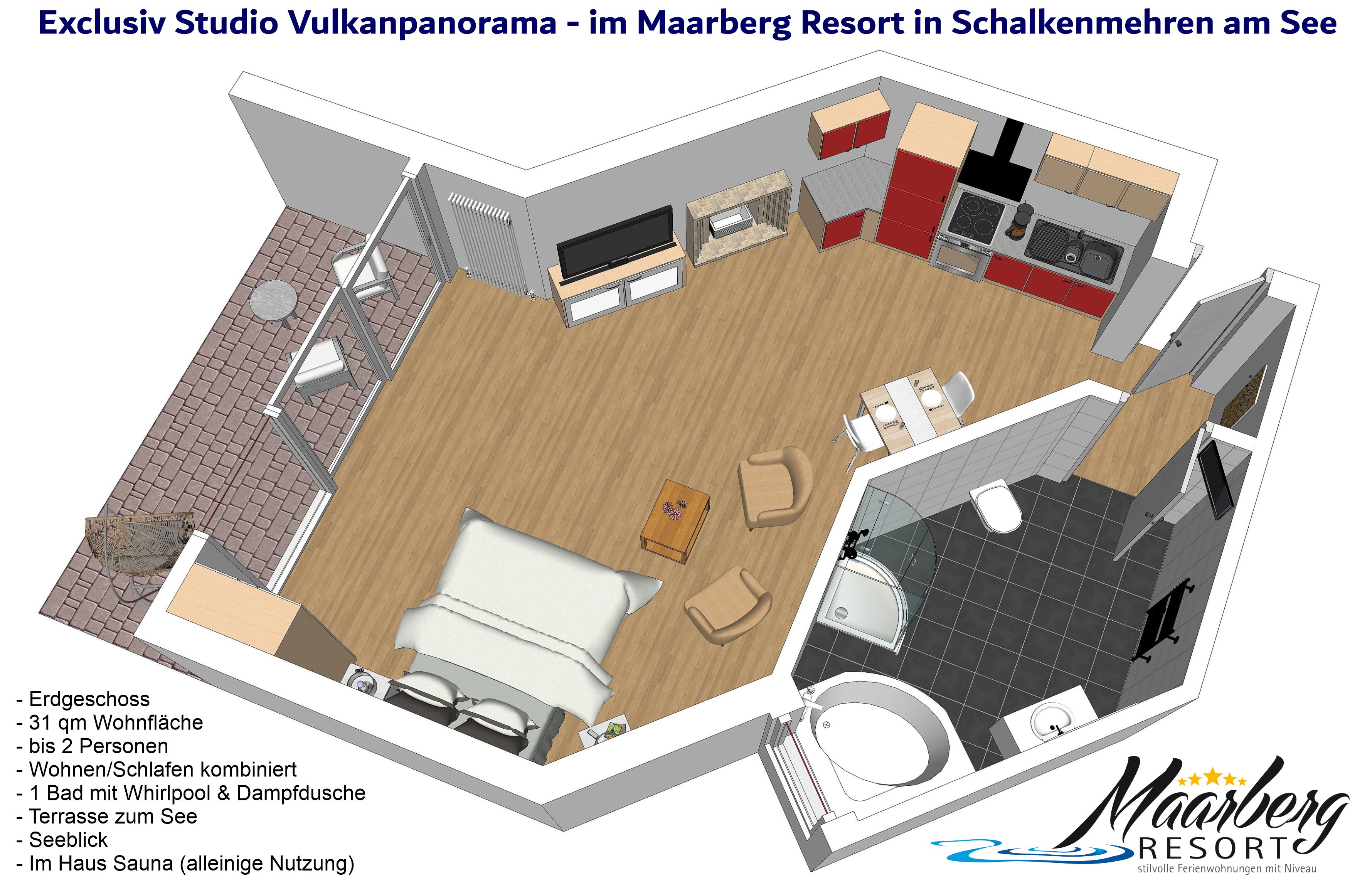 Die Apartmentanlage "Maarberg Resort" wurde komplett neu renoviert und neu ausgestattet. Sie liegt herrlich am Ortsrand von Schalkenmehren am See, in Hanglage am Waldrand. Bis zum See und Ortskern sind es nur ca. 400 m. Von vielen Ferienwohnungen im Maarberg Resort können Sie den schönen Blick auf den See genießen. Jede Wohnung verfügt über WLAN/WIFI Internetzugang. Haus mit neuer Sauna (auch zur alleinigen Nutzung) und klostenlos neue Jacuzzi im Saunaraum. Die wunderschönen Aussenanlagen mit Zierteichen und Wasserfällen werden Sie begeistern!